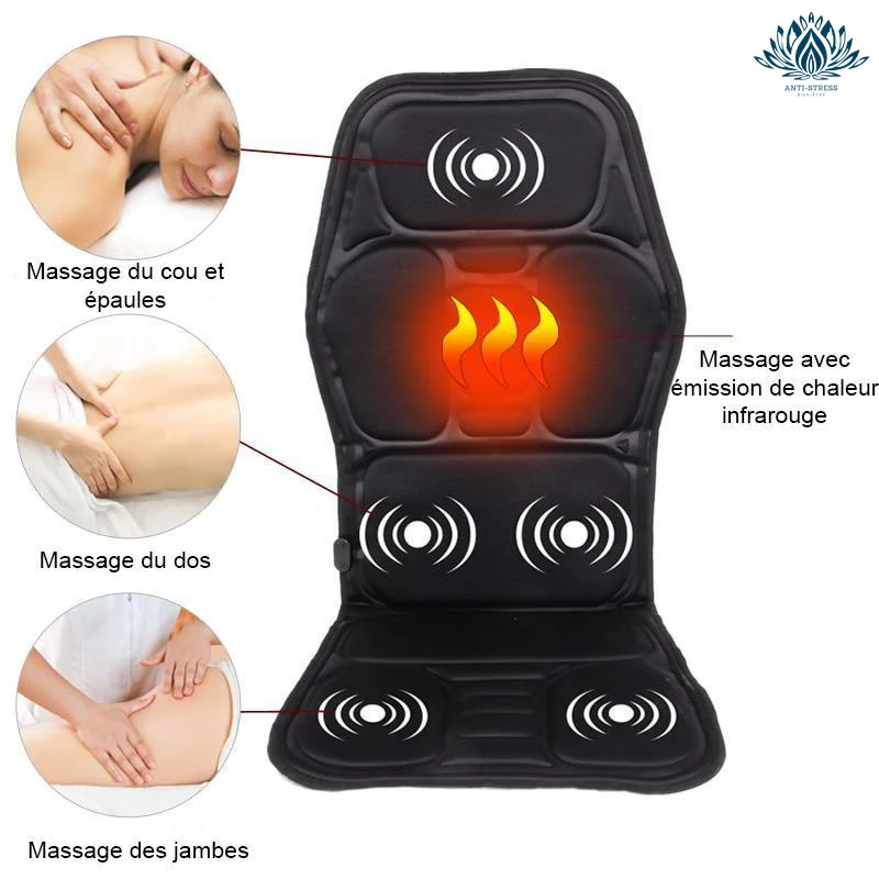 - Chauffant, vibrant et massant, ce siège de massage électrique possède une télécommande avec des programmes préenregistrés et étudiés pour le soulagement et l’apaisement complet des douleurs dorsales, cervicales et des lombaires. Sa fonction chauffante infrarouge permet le relâchement complet des muscles pour un massage en profondeur efficace.