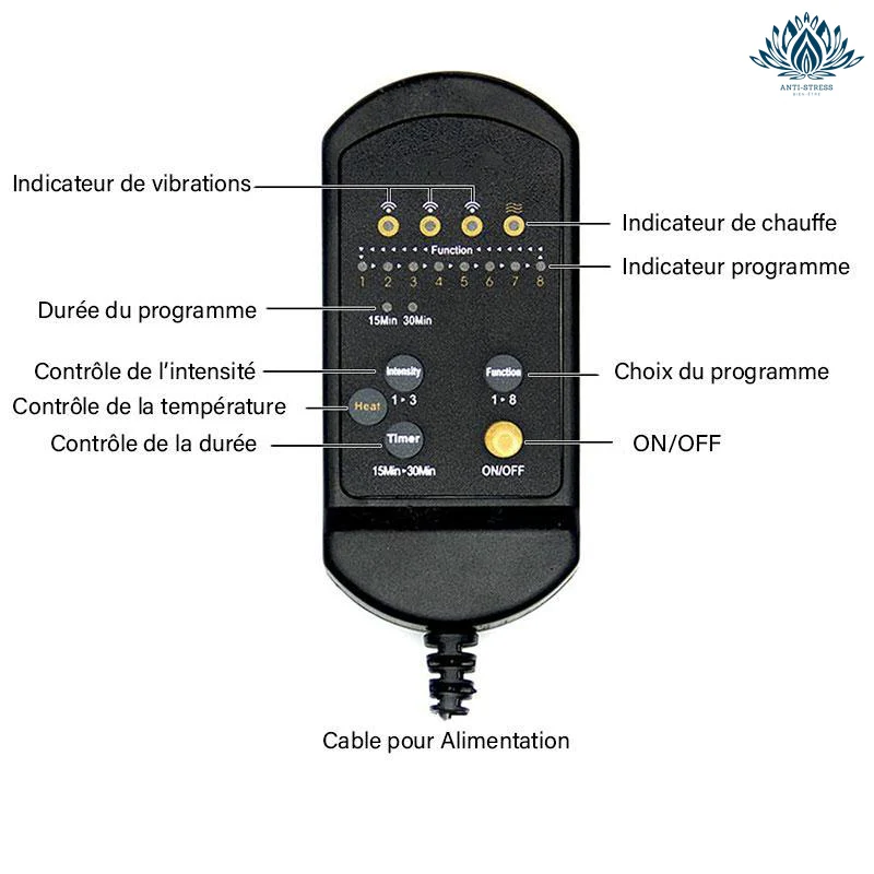 - Spécifications : Massage de la zone dorsale et vertébrale grâce à ses différentes zones de vibration et relaxation grâce à sa fonction de chauffe par infrarouge contrôlable avec la télécommande aux 20 programmes pré-enregistrés.