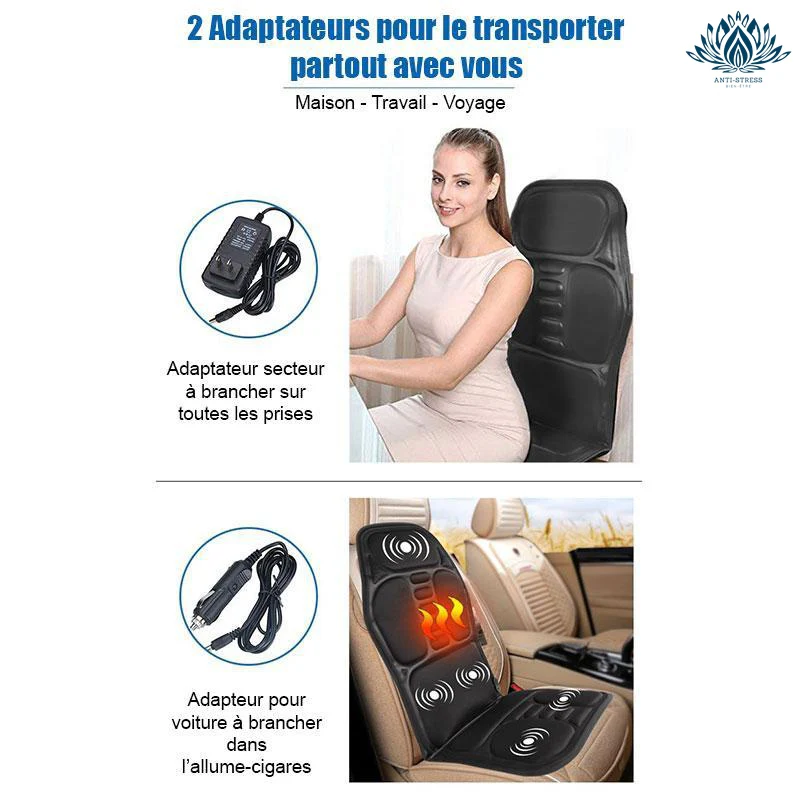 - Utilisé au travail, à la maison, ou en voiture il dispose d’un chargeur secteur et allume-cigares pour l’utiliser au moment où vous en avez le plus besoin. Il s’accroche aisément à un dossier de chaise au siège de voiture. Léger et ergonomique, il est compatible avec les morphologies féminines et masculines et permet une véritable physiothérapie professionnelle en déplacement.